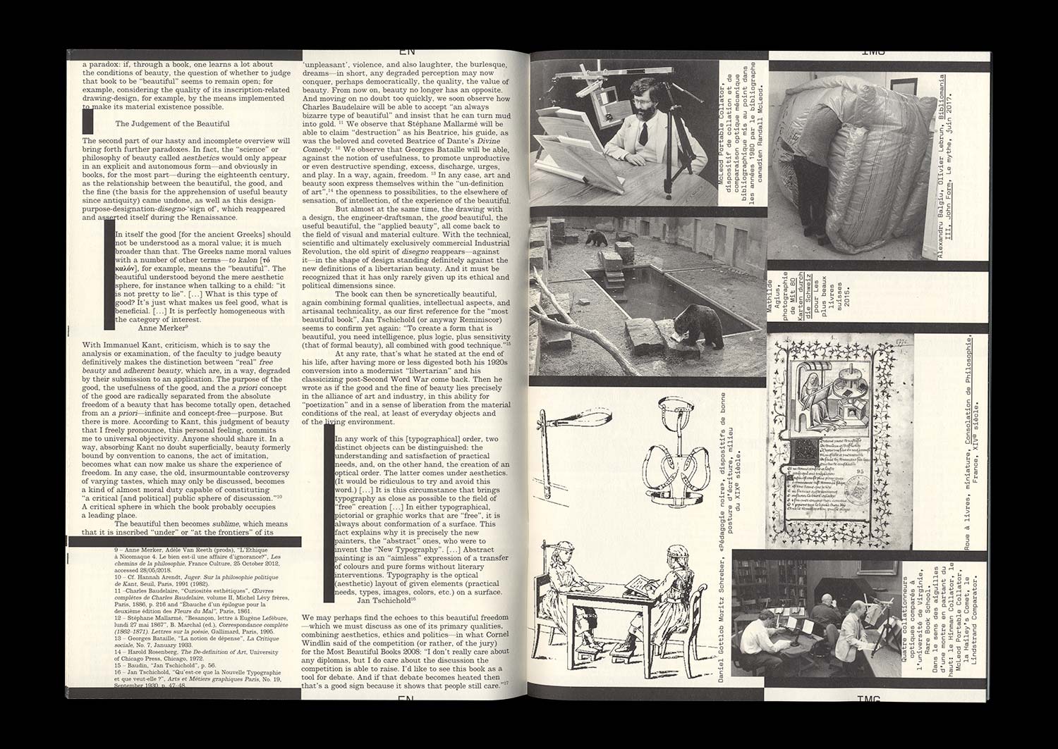 C’est au siècle des Lumières que l’esthétique s’autonomise, que le Beau se détache du Bien et de l’Utile comme accès libre au sens, à la vérité. Et l’on peut se demander si, à partir de la révolution industrielle, le design du dessin à dessein n’a pas dans une certaine mesure repris le flambeau des techniques appliquées de l’ancien régime de l’art de faire et de la beauté. Qu’en est-il dès lors du qualificatif de « beau » appliqué à la typographie comprise comme art de la mise en forme des livres depuis 1943 et la mise en place du « Prix des plus beaux livres suisses » sous l’impulsion du fameux Jan Tschichold?