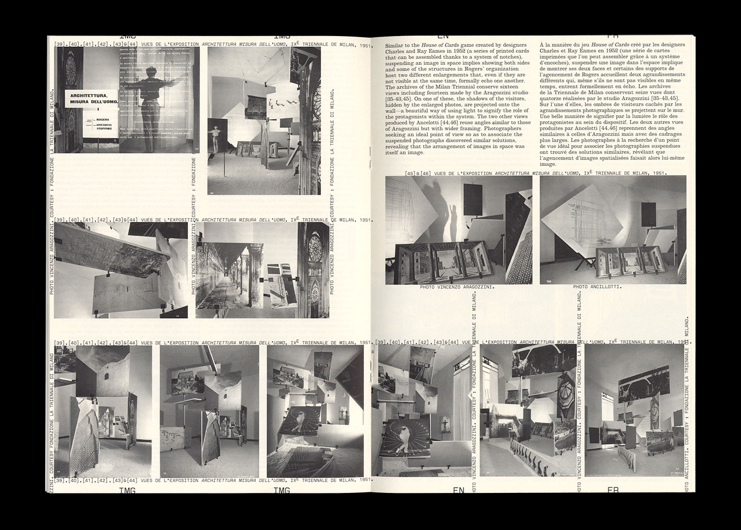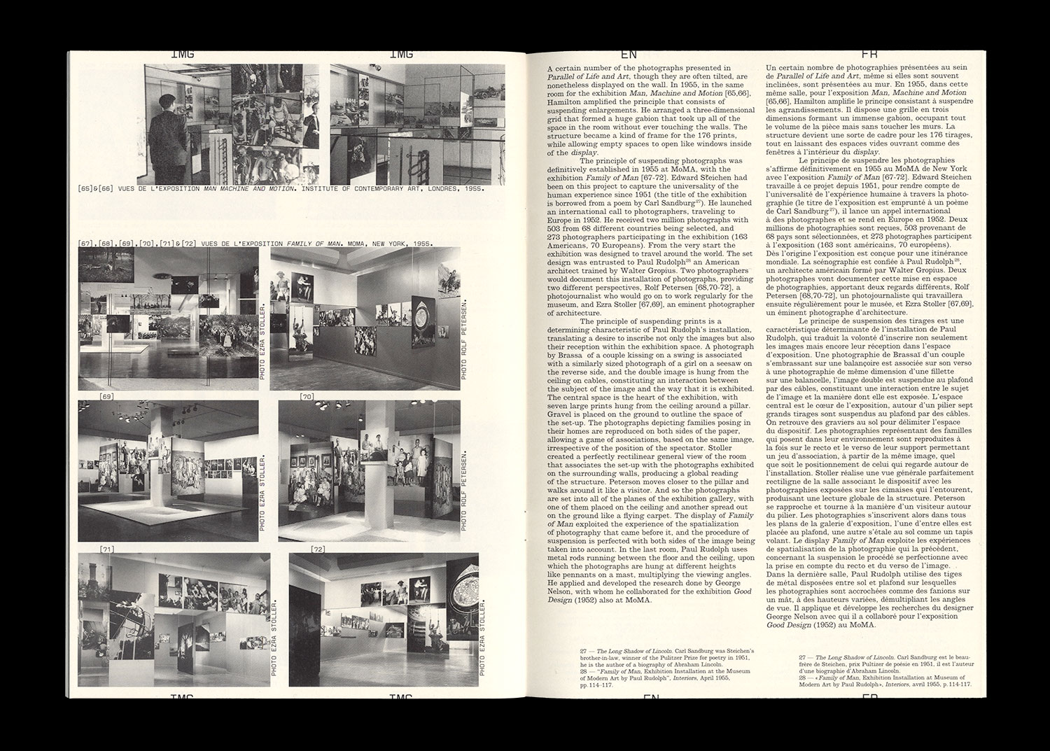 La tendance consistant à spatialiser la photographie, et plus spécifiquement la photographie documentaire, s’affirme clairement en 1951 à travers les expositions : The new landscape de György Kepes au Massachusetts Institute of Technology, Architettura, misura dell’uomo (IX Triennale de Milan) d’Ernesto N. Rogers, Vittorio Gregotti et Giotto Stoppino, et en 1953 Parallel of Life en Art à l’Institute of Contemporary Art (ICA) de Londres. Les documentations de ces trois «display» jouent un rôle essentiel sur l’évolution des modes de monstration de la photographie. Elles viennent, comme celles des expositions du MoMA mises en espace par Herbert Bayer, Road to Victory et Airway to Peace, alimenter la réflexion qui se développe magistralement dans l’ouvrage Display de Georges Nelson, publié en 1956.