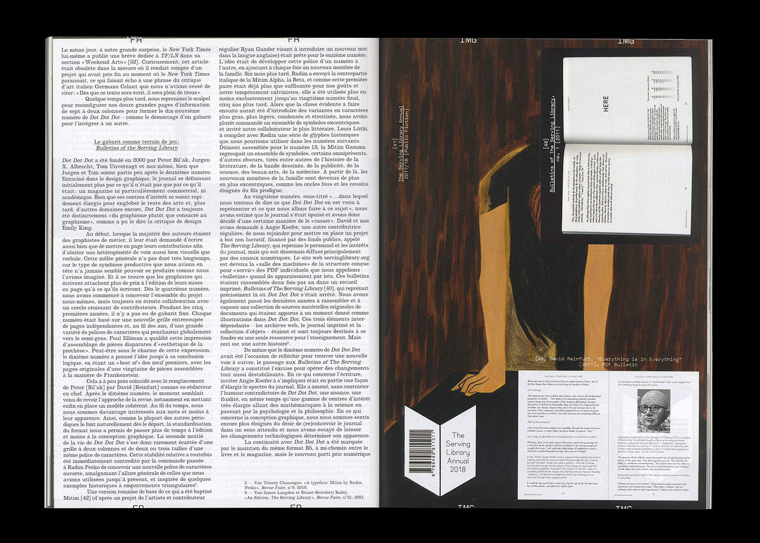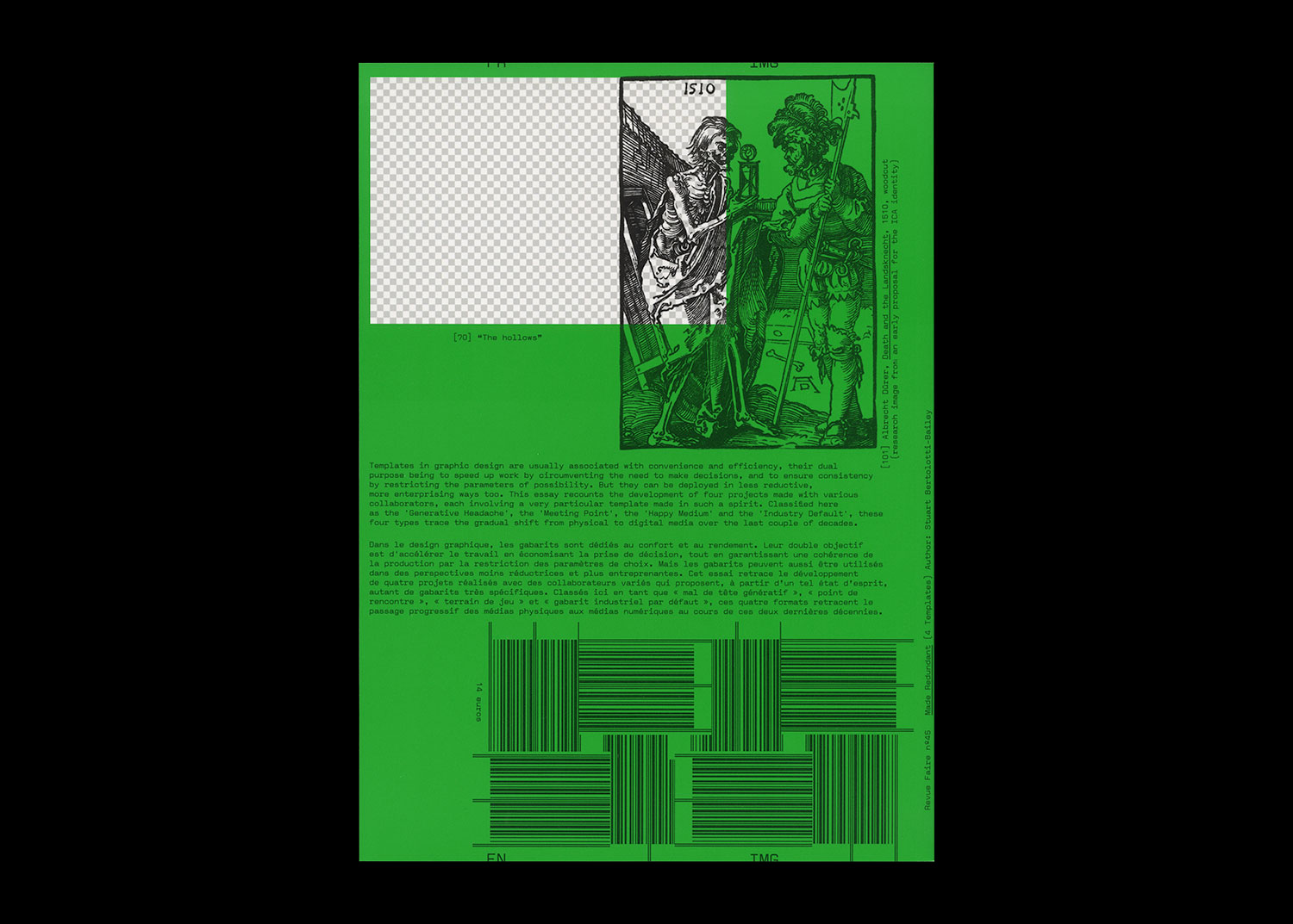 Dans le design graphique, les gabarits sont dédiés au confort et au rendement. Leur double objectif est d’accélérer le travail en économisant la prise de décision, tout en garantissant une cohérence de la production par la restriction des paramètres de choix. Mais les gabarits peuvent aussi être utilisés dans des perspectives moins réductrices et plus entreprenantes. Cet essai retrace le développement de quatre projets réalisés avec des collaborateurs variés qui proposent, à partir d’un tel état d’esprit, autant de gabarits très spécifiques. Classés ici en tant que « mal de tête génératif », « point de rencontre », « terrain de jeu » et « gabarit industriel par défaut », ces quatre formats retracent le passage progressif des médias physiques aux médias numériques au cours de ces deux dernières décennies.