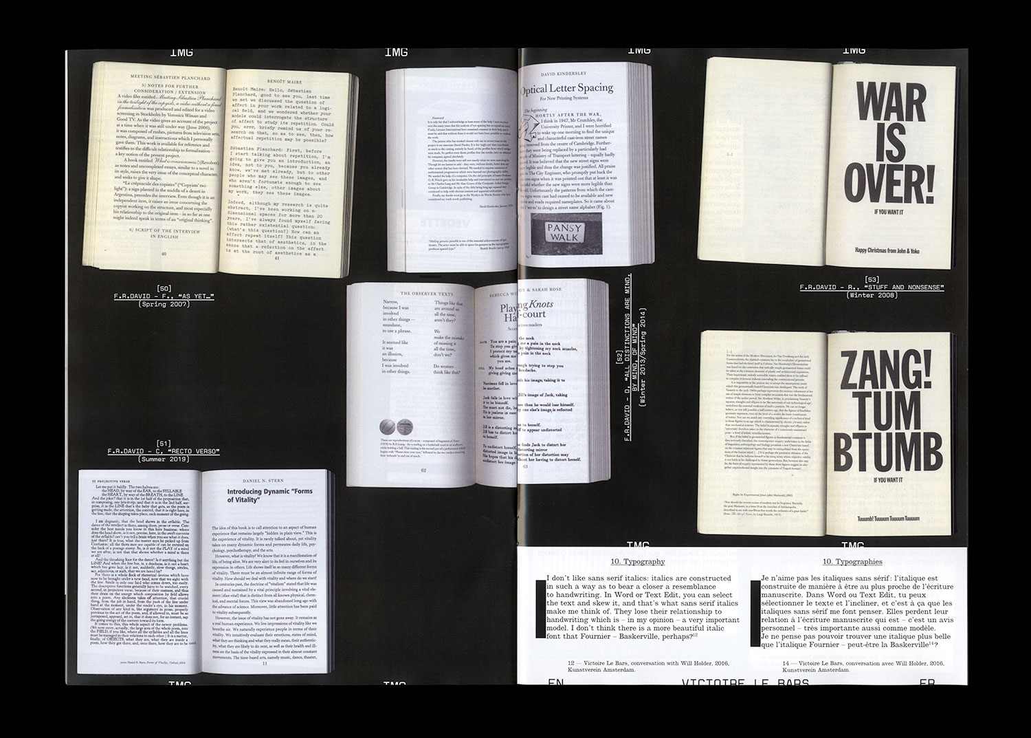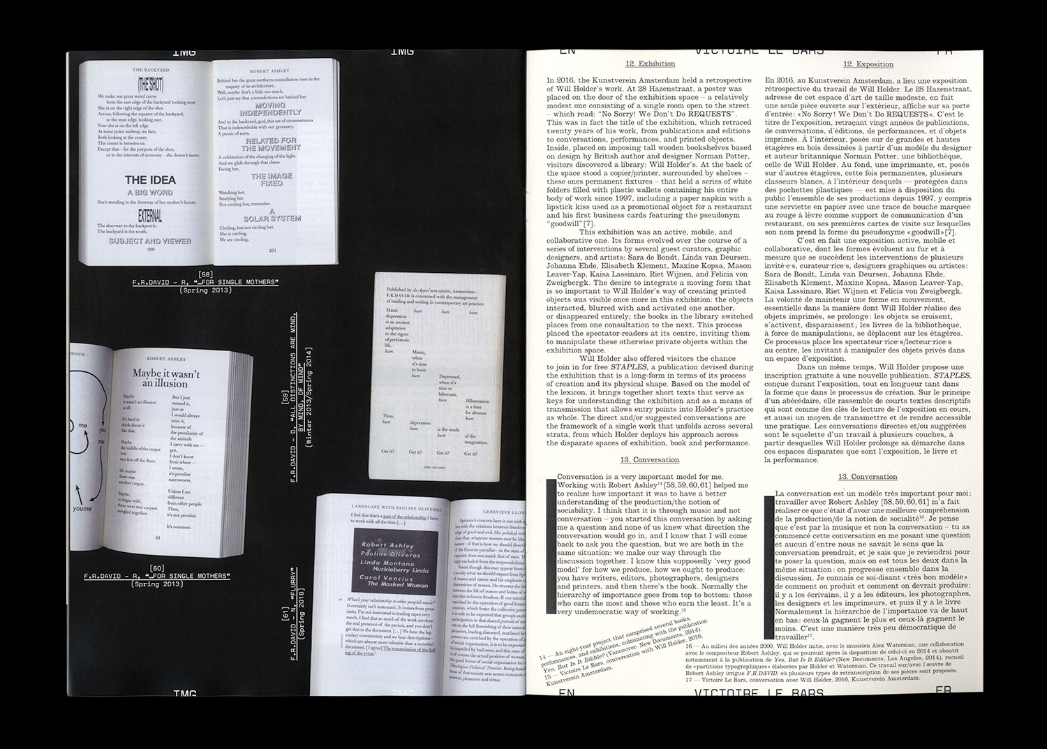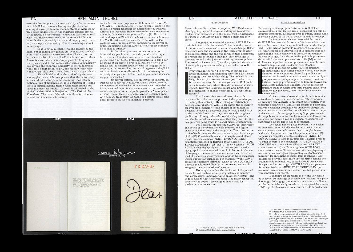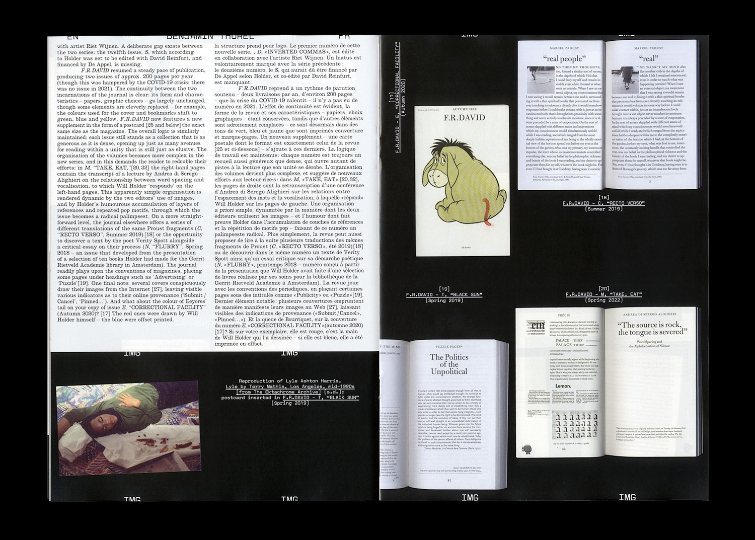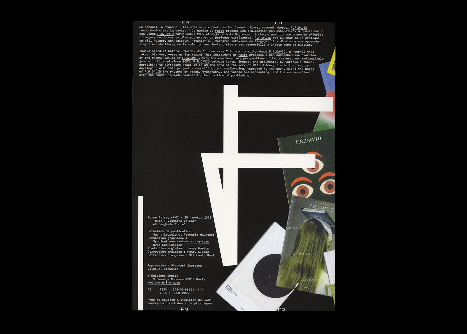 On connaît la chanson : les mots ne viennent pas facilement. Alors, comment aborder F.R.DAVID, revue dont c’est la devise ? Ce numéro de Faire propose une exploration non exhaustive, à quatre mains, des vingt F.R.DAVID parus entre 2007 et aujourd’hui. Regroupant à chaque parution un ensemble d’écrits, d’images, de documents d’auteur·e·s et de périodes différentes, F.R.DAVID est au cœur de la pratique de Will Holder, son éditeur. Attentif aux moindres inflexions du langage, il y développe une approche singulière du livre, où la relation aux lecteur·rice·s est essentielle à l’acte même de publier.