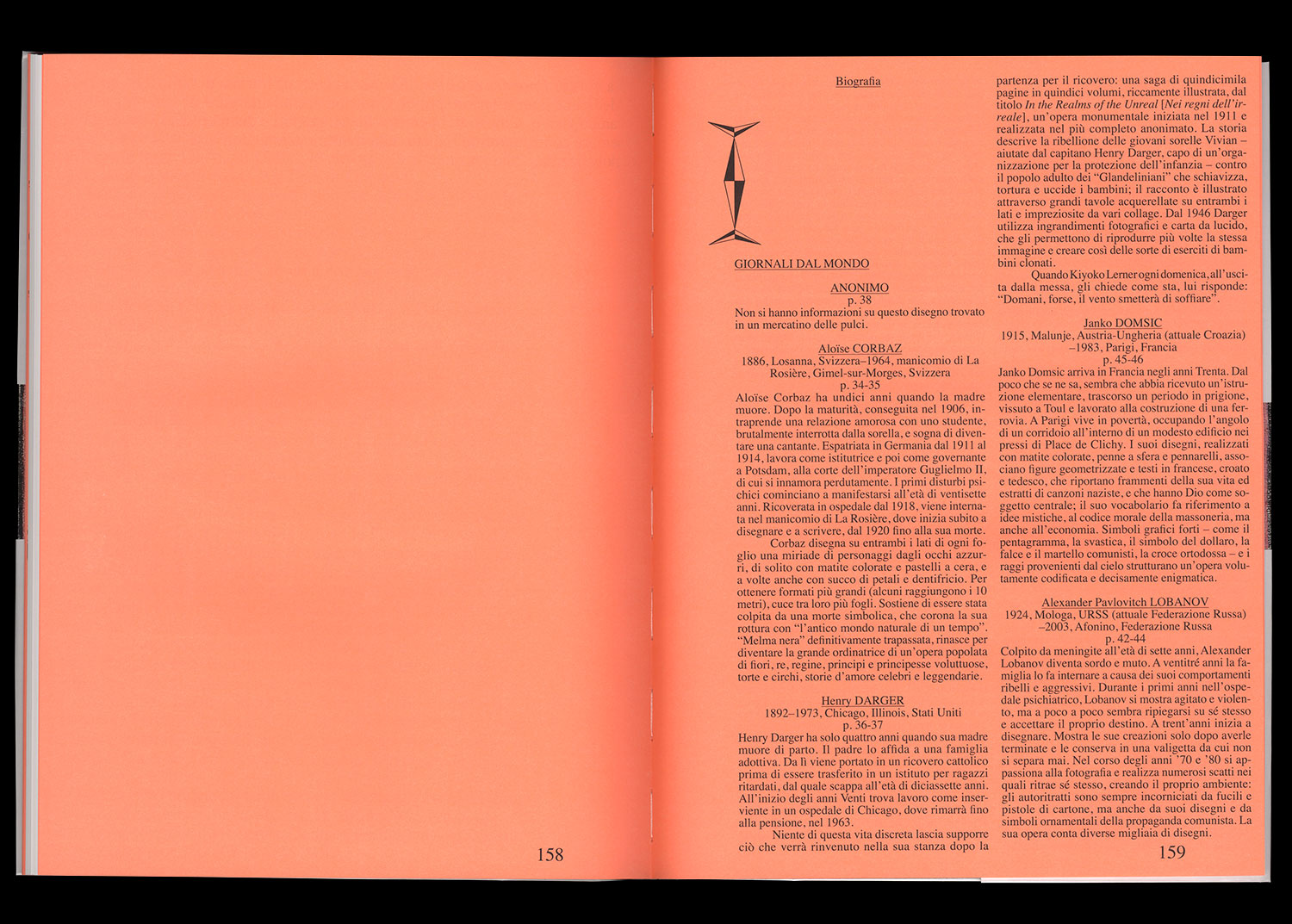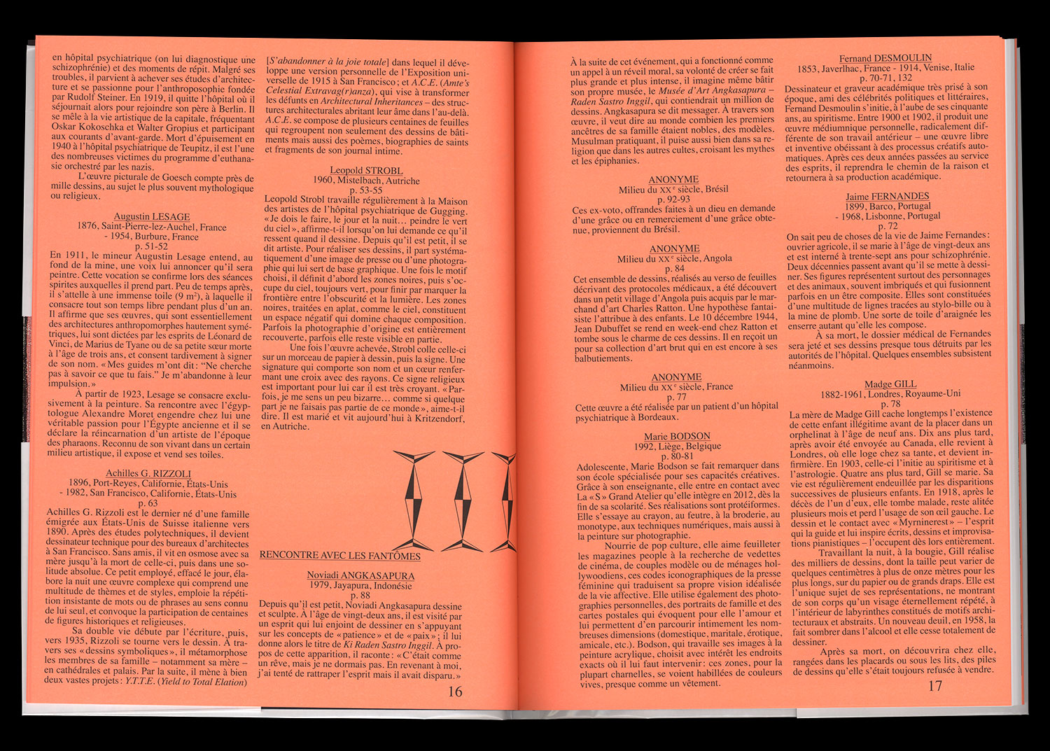 Featuring A.C.M., Noviadi Angkasapura, Anselme Boix-Vives, Marie Bodson, Giovanni Bosco, Gustavo Enrique Buongermini, Aloïse Corbaz, Fleury-Joseph Crépin, Egidio Cuniberti, Henry Darger, Fernand Desmoulin, Janko Domsic, Dong-Hyun Kim, Jaime Fernandes, Eugen Gabritschevsky, Pietro Ghizzardi, Madge Gill, Paul Goesch, Jorge Alberto Hernández Cadi, Paul Humphrey, Zdeněk Košek, Joseph Lambert, Gustave Pierre Marie Le Goarant de Tromelin, Augustin Lesage, Pascal Leyder, Alexander Pavlovitch Lobanov, Ramon Losa, Dwight Mackintosh, Lázaro Antonio Martínez Durán, Mettraux, Edmund Monsiel, John Bunion Murray, Iwona Mysera, Koji Nishioka, Masao Obata, Jean Perdrizet, M. Pierron, Photographies Spirites, Miloslava Ratzingerová, Marco Raugel, Achilles G. Rizzoli, Leopold Strobl, Harald Stoffers, Mose Tolliver, Melvin Way, Scottie Wilson, Adolf Wölfli, Anna Zemánková, Carlo Zinelli, Unica Zürn.
