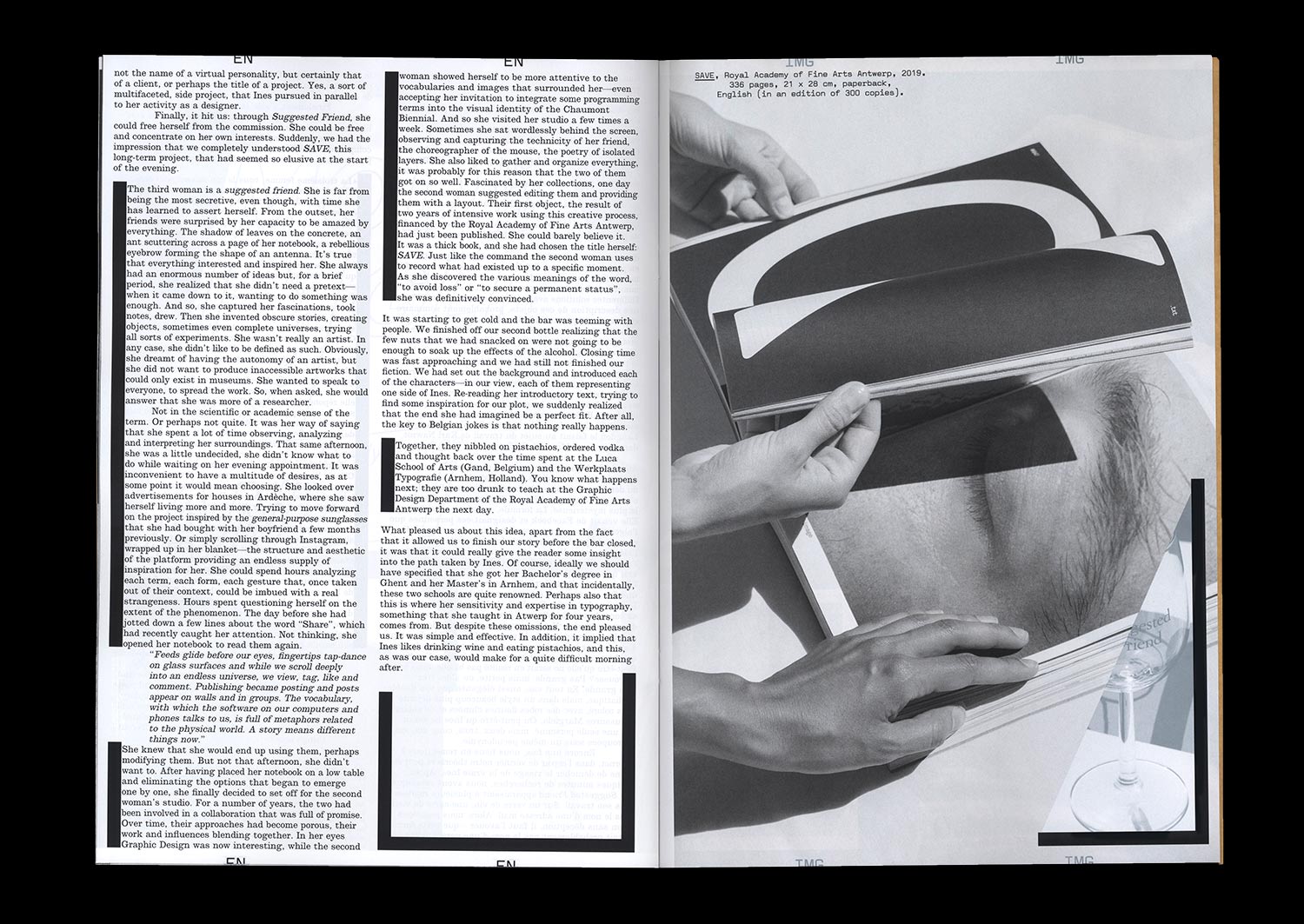 Three women walk into a bar. The first lives in a large apartment in Anvers, Belgium. The second is an independent Graphic Designer who founded her own studio. The third is an avatar—you might even know her—with a certain interest in creative processes, their interfaces, and their vocabularies. Together, they eat some pistachio nuts, order vodka, and are not at all sure about getting up the next day to teach at the Royal Academy of Fine Arts. But together, more than anything else, they form the troubling multiple personality of Ines Cox, a Belgian Graphic Designer who met Julia Andréone and Manon Bruet in her studio in June 2019. An opportunity to develop a narrative driven by three voices and to trace the outline of a path, a practice, and a figure.