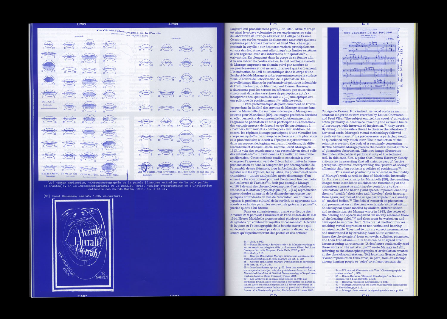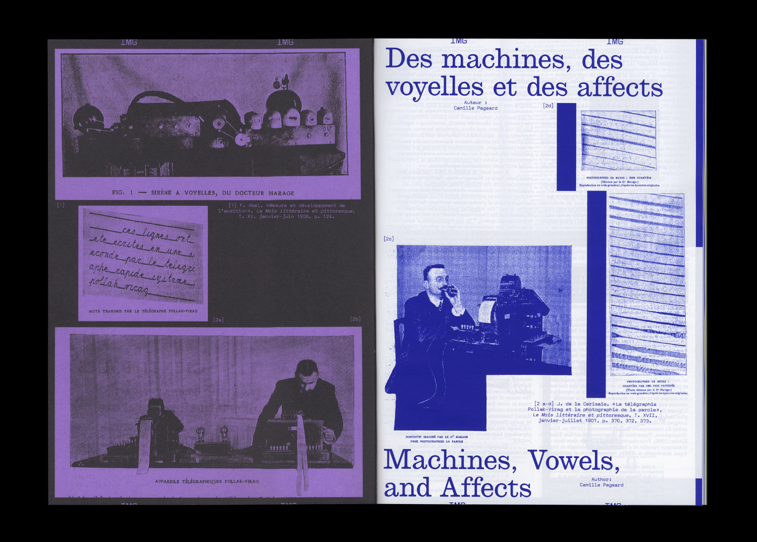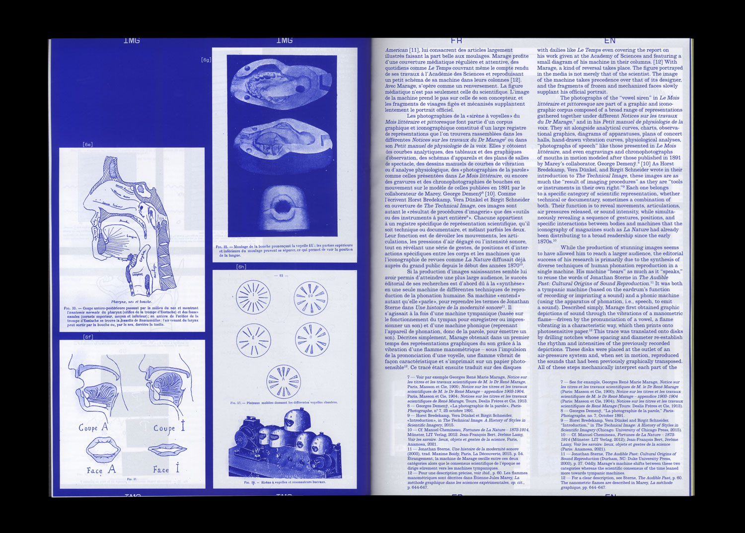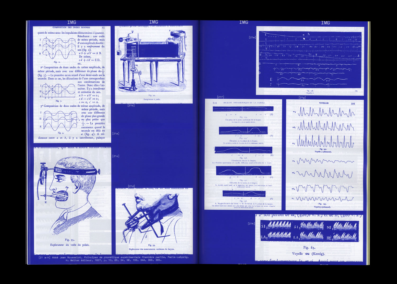 Built at the very end of the 19th century to study the physiology of the voice, Dr. Marage’s vowel machine sheds new light on the origins of sound measurement and the extensive field of writing the voice. Throughout the 20th century, the machine’s appearances in print were driven by a constant scientific curiosity for the mechanical reproduction of the voice along with an upheaval in affective relationships with machines. Coupled with the history of graphic inscription of the voice, it reveals a unique history of our attraction and repulsion to technical objects. Through its visual representations and mechanical and technological transfer, an “order of language” also emerges—a politics of language that continues to be exercised in contemporary forms of subjugation.