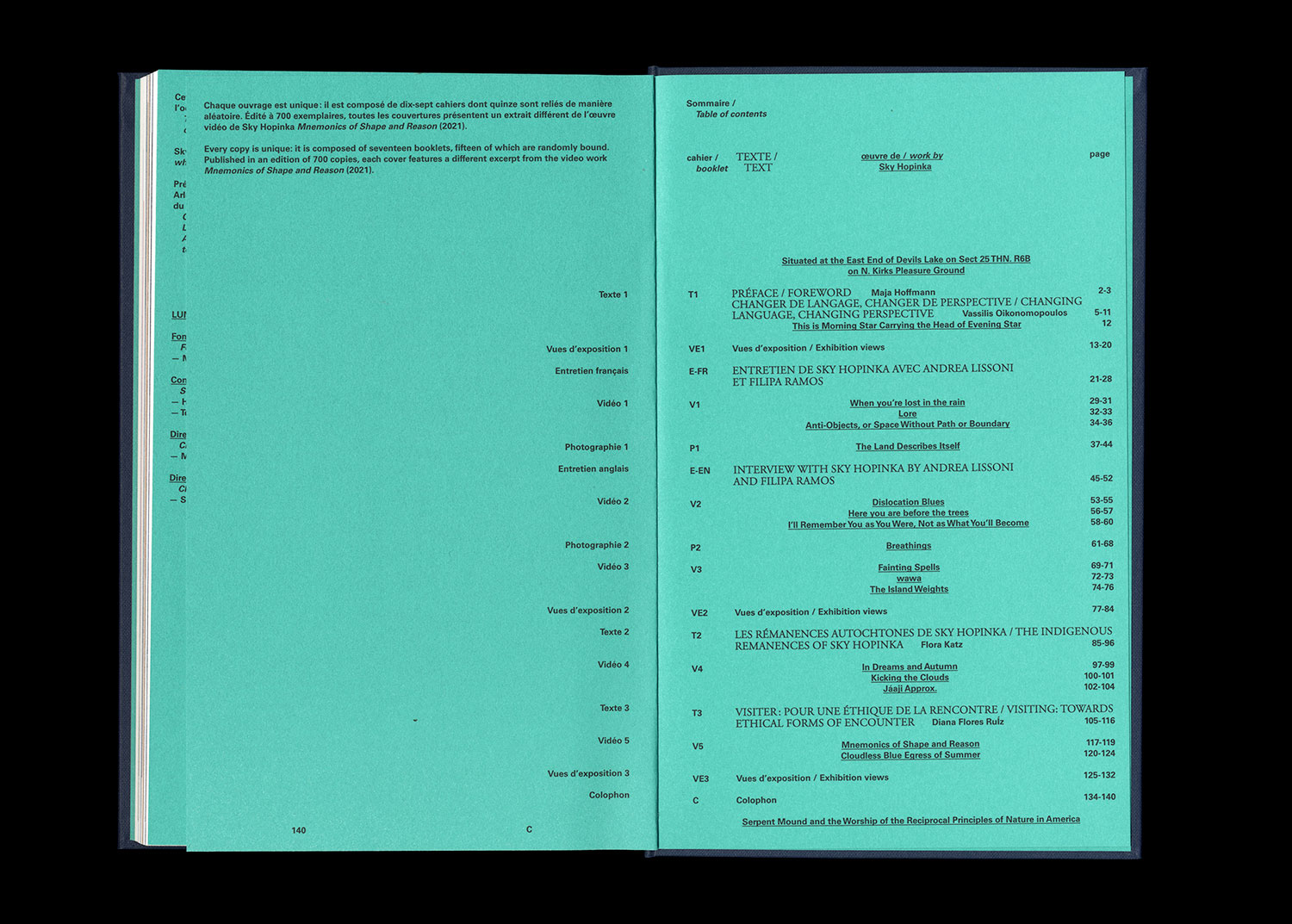 Every copy is unique: it is composed of seventeen booklets, fifteen of which are randomly bound. Published in an edition of 700 copies, each cover features a different excerpt from the video work Mnemonics of Shape and Reason (2021).