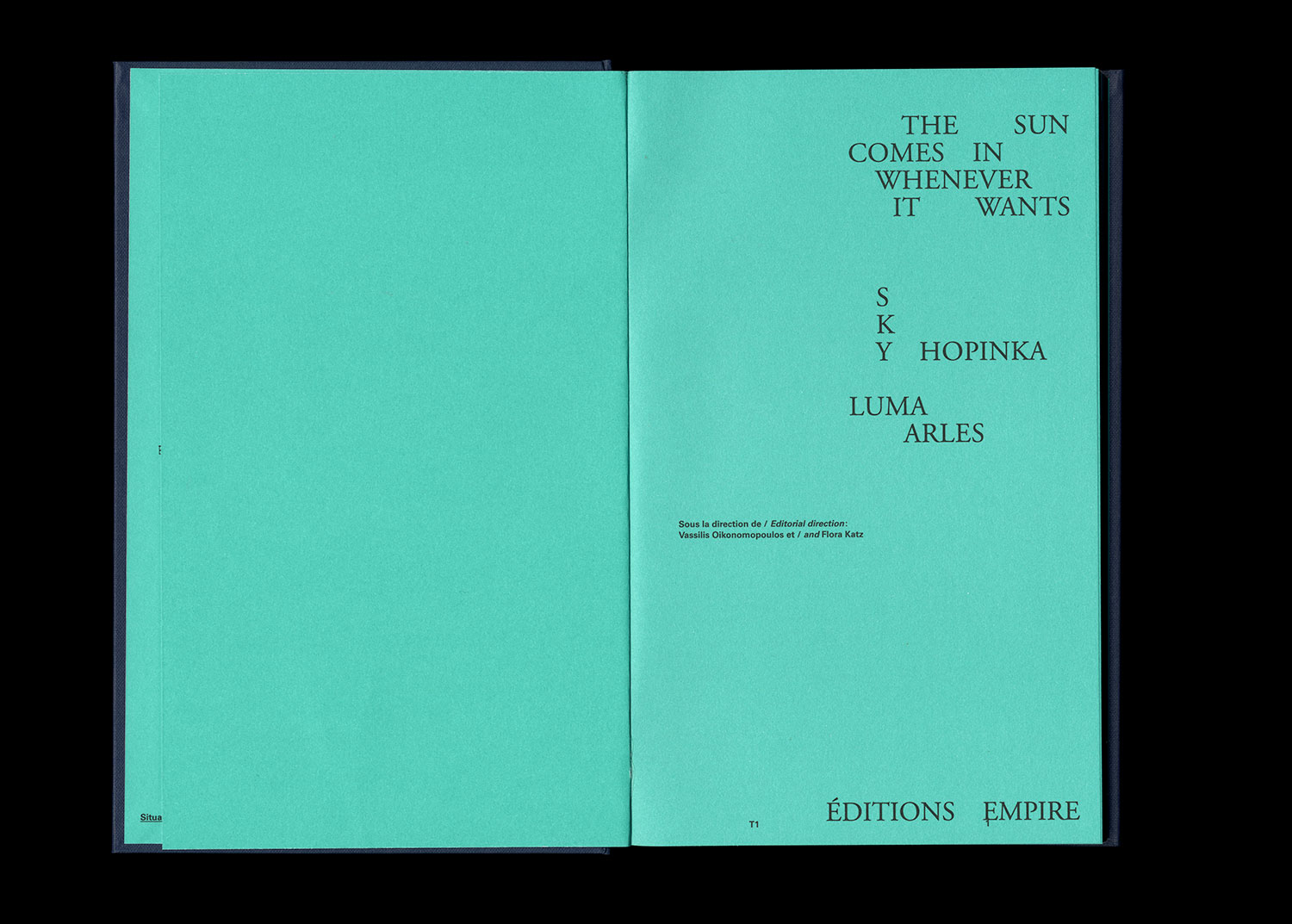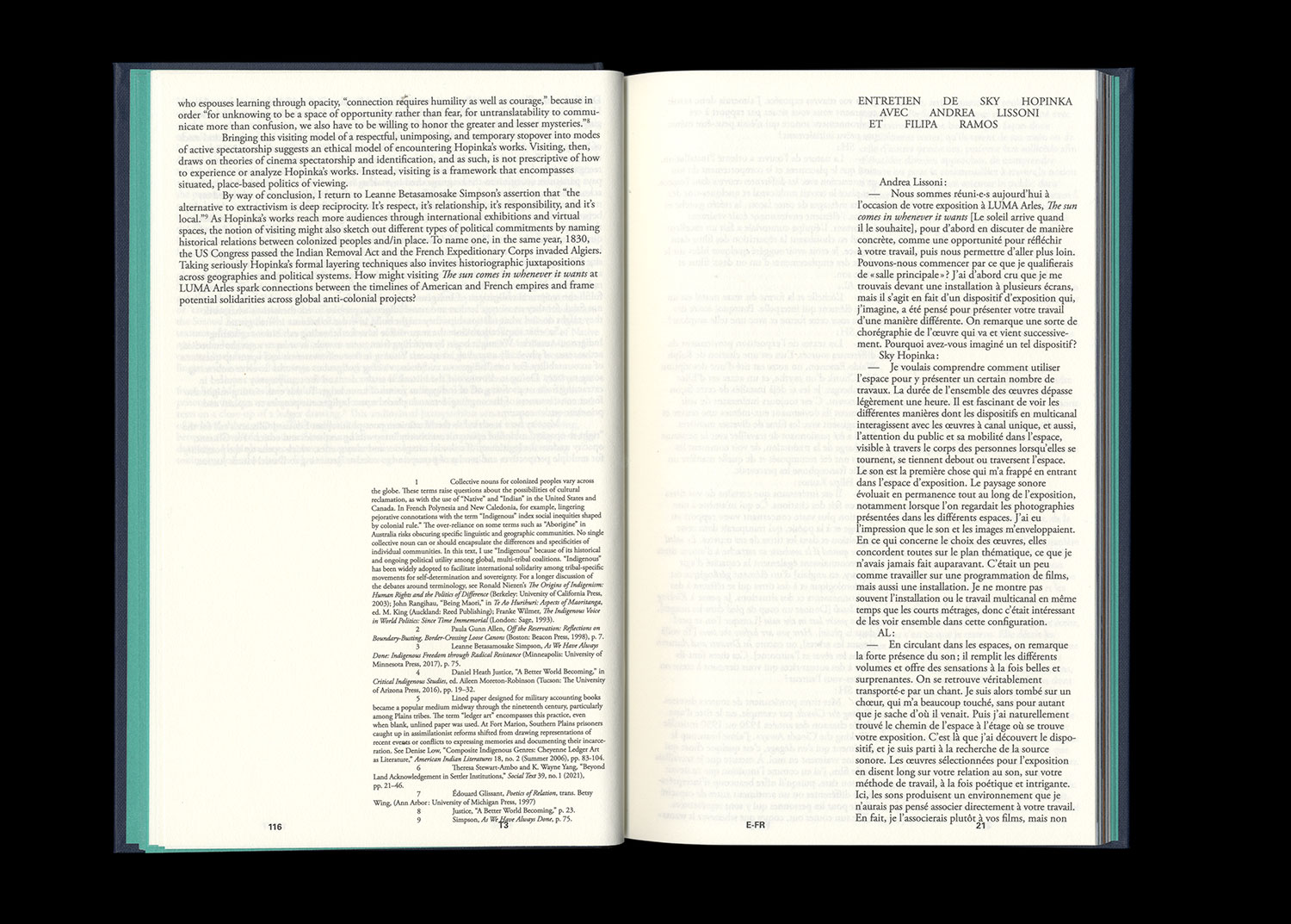 An exhibition of the work of Sky Hopinka at LUMA Arles. This publication includes essays by Flora Katz, Vassilis Oikonomopoulos and Diana Flores Ruíz. An interview with Sky Hopinka by Andrea Lissoni and Filipa Ramos.