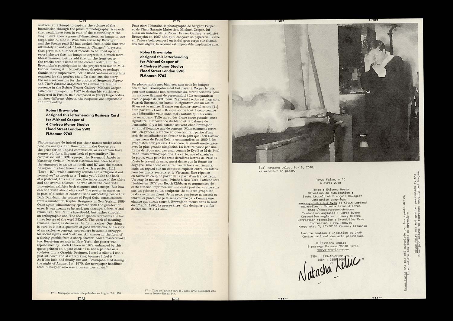 The figure of Robert Brownjohn oscillates between New York and London, swaying between the 1950s and the 1960s, juggling, within the profusion of his production, with typographic games and photographic essays, identities on headed notepapers and advertising installations, packaging in the form of a rejected project and the opening credits that went on to become an archetype for every other spy movie. Constantly stumbling between life and ideas, the trajectory of this student prodigy of Moholy-Nagy who later became the design prodigy of swinging London is a line that never ceases to end. Whether he burned too bright or simply burned too much, this unruly genius forced the gaze of history to turn away, preferring to look elsewhere so as not to frighten the other well behaved children. Little matter the story, once it is signed Love B.J. This 10th issue of the magazine Faire contains original watercolors by Natacha Leluc.